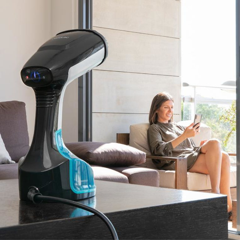 Vaporizador manual de 1400W con tecnología Power Steam de 25 g/min. Calentamiento rápido en 30 segundos, panel táctil y sistema de autoapagado para un planchado vertical seguro.