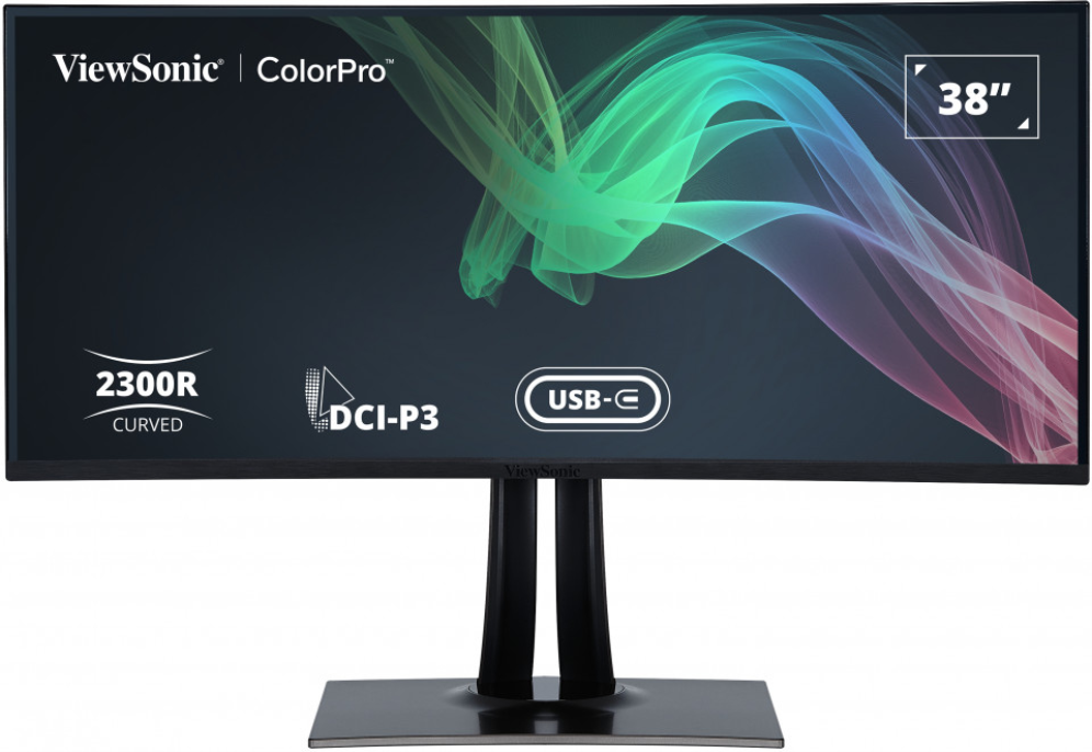 Monitor profesional curvo Viewsonic VP3881A de 38 pulgadas. Ofrece resolución WQHD+ (3840 x 1600) y tecnología LED, ideal para edición de vídeo y diseño de alta precisión.
